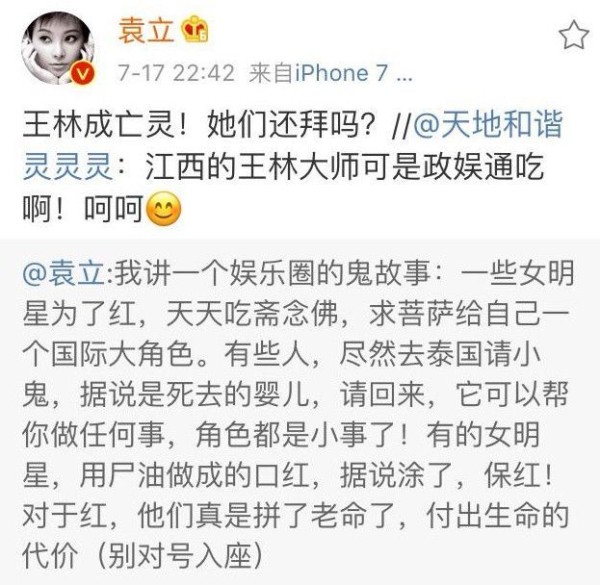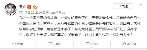 “一些女明星为了红,天天吃斋念佛,求菩萨给自己一个国际大角色。有些人,尽然去泰国请小鬼,据说是死去的婴儿,请回来,它可以帮你做任何事,角色都是小事了!有的女明星,用尸油做成的口红,据说涂了,保红!对于红,他们真是拼了老命了,付出生命的代价(别对号入座)。”随后,她还补充到:“红,是她们的信仰!可以不择手段,可以没有尊严,可以不顾一切!这段话是袁立在昨晚十一点多发的一篇微博,首先我们不对号入座!