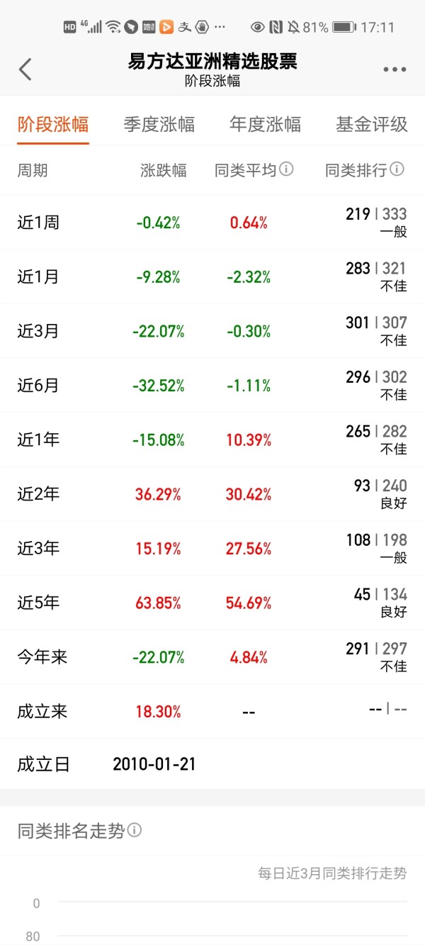下面说说我最近的研究方向,主动型基金,我发现最近明星基金经理的表现都很拉垮,尤其拉垮的是张坤。比如,他的$易方达亚洲精选的表现是这样的: