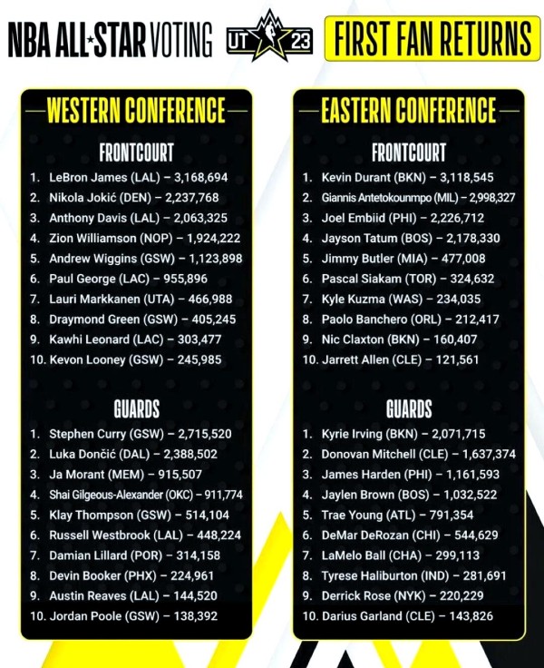 今日,NBA官方揭晓了2022-23赛季全明星正赛球迷票选的首阶段结果。湖人队前锋勒布朗·詹姆斯与篮网队前锋凯文·杜兰特分别荣膺东西部票王。特别值得一提的是,詹姆斯在2022-23赛季全明星票选第一阶段中,以3168694票的高票数成为票王,成为目前联盟中唯一票数突破315万的巨星。他的这一成就充分展现了詹姆斯和杜兰特在联盟中的人气地位,即便如今众多超级新秀崭露头角,也难以动摇这二人的影响力。