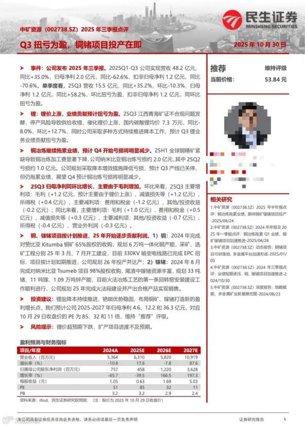 中矿资源 重点机构:富国基金、泓德基金、嘉实基金、景顺长城基金、兴证全球基金、易方达基金、上海半夏投资管理中心 调研摘要: 1、公司2025年三季报的财务数据情况。 2025年三季度,公司实现营业收入15.51亿元,比上年同期增长35.19%;实现归属于上市公司股东的净利润1.15亿元,比上年同期增长58.18%,环比增长352.11%;实现扣非后归属于上市公司股东的净利润1.15亿元,比上年同期增长488.28%,环比增长425.31%;实现基本每股收益0.1595元/股,比上年同期增长58.08%。 2025年前三季度,公司实现营业收入48.18亿元,比上年同期增长34.99%;实现归属于上市公司股东的净利润2.04亿元,比上年同期下降62.58%;实现基本每股收益0.2831元/股,比上年同期下降62.57%;公司经营活动产生的现金流量净额4.92亿元,比上年同期增长392.18%。 截至2025年9月30日,公司总资产181.86亿元,比上年度末增长5.77%;归属于上市公司股东的净资产120.14亿元,比上年度末下降1.38%;公司金融类资产(含货币资金、交易性金融资产、应收款项融资等)期末余额合计57.04亿元,比上年度末增长20.76%。 2、公司锂电新能源板块经营情况介绍。 2025年三季度,公司所属津巴布韦Bikita矿山生产锂辉石精矿8.1万吨;今年前三季度,公司共生产锂辉石精矿25.6万吨。 2025年三季度,公司生产锂盐8000余吨,实现销售1.26万吨;今年前三季度,公司生产锂盐3.14万吨,销售锂盐3.05万吨。 2025年6月,为进一步降低锂盐业务生产成本,加速推进绿色低碳发展模式,江西中矿锂业对年产2.5万吨锂盐生产线进行综合技术升级改造,投资建设年产3万吨高纯锂盐技改项目,预计停产检修及技改时间为6个月。项目建成投产后,公司将合计拥有418万吨/年锂矿处理能力和7.1万吨/年电池级锂盐产能,公司锂盐业务的综合竞争力进一步增强,将更好地应对行业变革与市场挑战。 3、公司稀有轻金属(铯、铷)板块经营情况介绍。 2025年前三季度,公司铯铷业务营业收入超过9亿元,同比增长约25%;毛利超过6亿元,同比增长约25%。铯铷板块整体表现稳中有升。 在全球绿色转型与科技革命交汇的关键时期,铯铷产业站上了新一轮发展的风口。作为不可再生的战略性稀有金属,铯铷因其优异的光电性能、离子活性和催化特性,不仅在传统领域如特种玻璃、精密陶瓷等持续发挥作用,更在5G通信、航空航天、量子计算、能源电池等高精尖领域展现出巨大的应用潜力。 我公司凭借“资源+技术+市场”三位一体的战略布局,已逐步构筑起以铯铷资源为核心、精深加工为支撑、高端应用为导向的全产业链竞争优势,成为具备全球资源整合能力的铯铷行业龙头企业。未来,公司将继续强化“链主”使命,积极拓展下游高附加值市场,引领铯铷产业向价值链高端迈进,为全球绿色低碳转型和科技自主创新提供关键材料支撑。 券商研报: