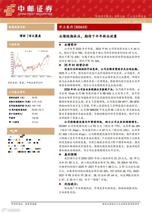 开立医疗 重点机构:交银施罗德基金、中欧基金、泓德基金、嘉实基金 调研摘要: 问:今年 1-9 月公司业务按国内、国际及产品线分类的增长情况? 答:2025 年 1-9 月,公司国内业务收入整体增长超过 6%,国际业务收入增长超过 2%,其中国际业务收入占比超过 45%,代表公司国内、国际业务收入结构均衡,两个市场发展均较为稳健。从产品线维度看,今年前三季度公司内镜业务同比增长接近6%,超声业务受集采及毛利率下降影响同比下滑 6%,外科业务同比增长 80%,血管内超声业务同比增长 270%。另外,根据公司各产品线的前三季度累计终端中标,公司内镜产品的市占率明显提升,超声产品的市占率保持稳定,硬镜、血管内超声的市占率快速提升,公司各产品线的发展均符合预期。 问:公司三季度毛利率下降较多的原因? 答:公司毛利率下降主要有两个方面原因: 一是由于国内超声行业集采项目相比往年增加较多,造成超声产品的单价承压,超声行业的毛利率整体下行,受此影响,公司国内超声业务的毛利率有所下降;面对行业环境的不利情况,公司加快推出新的高端超声产品,致力于通过提升高端产品的占比稳定毛利率。 二是由于公司外科、血管内超声等新产品毛利率相对较低,其规模增长后拉低公司整体毛利率。对此,公司已经通过技术研发完成血管内超声产品的降本增效,预计新产品上市后,将显著改善毛利率。 随着公司超声 80/90 平台、内镜 HD-650、硬镜 4K-200 等各产线新一代高端产品逐渐放量,以及新产品线的降本增效措施效果显现,将对公司整体毛利率产生提振。 问:公司前三季度现金流较差的原因? 答:相比于去年同期,公司今年前三季度经营活动产生的现金流量净额下滑比例较大,主要原因在于公司今年在关税战期间增加了部分关键零部件的战略备货,现金支出增加较多,另外一方面在于公司本期支付员工薪酬增加。剔除这两个因素影响,公司现金流与往年相比较为正常。从年度的维度看,公司过去连续多年均取得正向的年度经营现金流入,业务发展极为稳定。 问:公司今年新推的 HD-650 系列内镜的情况? 答:公司今年重磅推出的 HD-650,支持 4k 分辨率,实现超分辨率成像,支持超声内镜、内镜下小探头等同屏融合显示,采用新一代插入管技术,显著提升镜体操控,支持放大及可变硬度等高端镜体,同时导入了 AI 胃部及肠道质控、息肉检出等,HD-650 系列内镜进一步完善了公司内镜产品线的布局,提升了临床表现力,具备与高端进口品牌相竞争的实力。HD-650 系列内镜自今年二季度上市以来,临床表现优异,受到国内外专家的广泛好评,目前已实现小批量销售,预计将逐渐放量,对公司内镜业务的增长提供重要助力。 券商研报:
