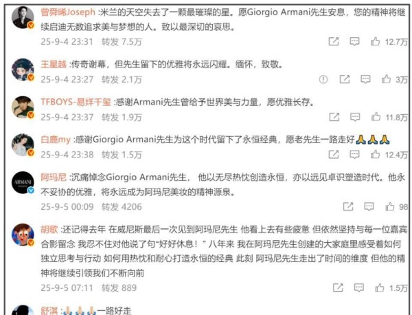 章子怡易烊千玺白鹿胡歌等明星发文悼念阿玛尼遭吐槽,粉丝辩驳