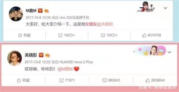 记得当初鹿晗公布恋情的那天,小编正无聊地刷着微博,突然刷到鹿晗的这条微博,一开始仅仅是看了一眼就刷过去了,那时候鹿晗关晓彤正在拍新剧,小编以为只是为了宣传新剧,没想动两分钟之后微博瘫痪,小编的一个朋友还给我打电话哭说自己喜欢这么多年的人公布恋情了,自己失恋了。