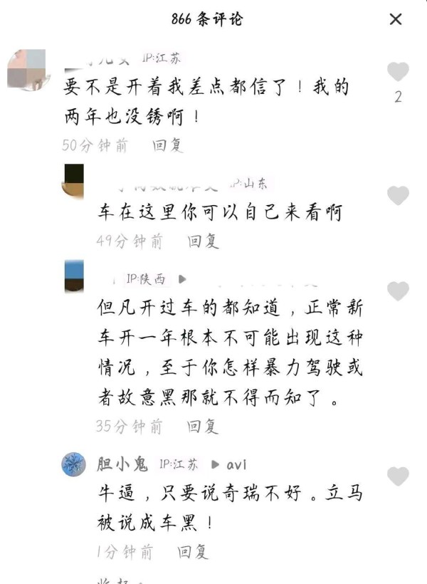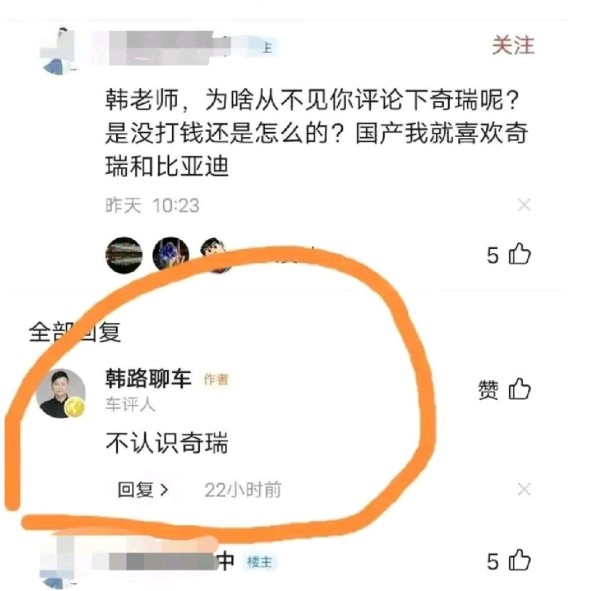 而在去年,在某位百万粉丝汽车博主的作品下面有位网友问这位车评人为什么不评价一下奇瑞的车子呢?是没打钱还是怎么的。然后该车评人直接说“不认识奇瑞”,然后,评论区就被攻陷了,上千条评论留言,然后就是问候祖宗十八代的亲切问候!
