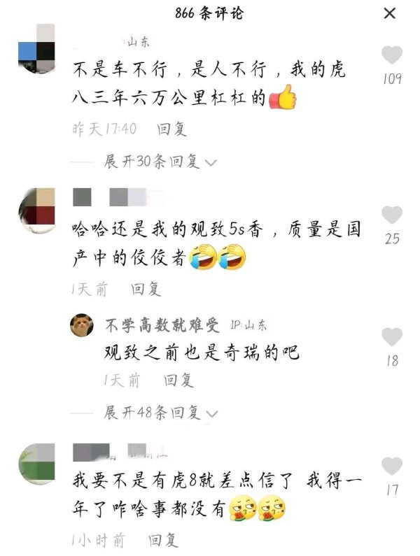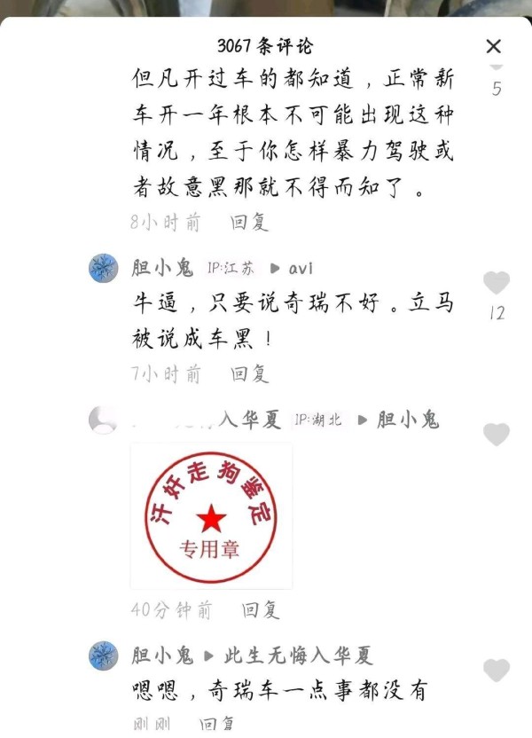 我有时候是真的挺佩服奇瑞,纵然有这么多负面的声音,奇瑞却从来没有出来回应过。给奇瑞正名的,基本都是一些奇瑞的车主和有良心的自媒体从业者!要是奇瑞重视起来,人家特斯拉500万警告,长城的100万起诉大飙车,比亚迪5万警告,你奇瑞即使也是5万警告,也不至于是被那部分人是肆无忌惮的搞事情!