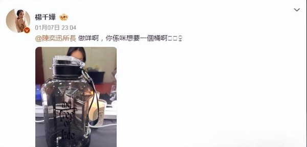 杨千嬅也很快就回应了陈奕迅的恶搞,她在社交媒体上发了一条消息,说:“做咩啊,你係咪想要一個桶啊?”她的反应既幽默又可爱,表明了她对陈奕迅的友好和包容,没有因为他的开玩笑而生气。