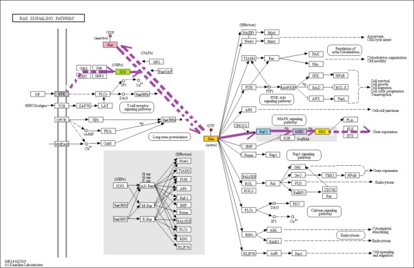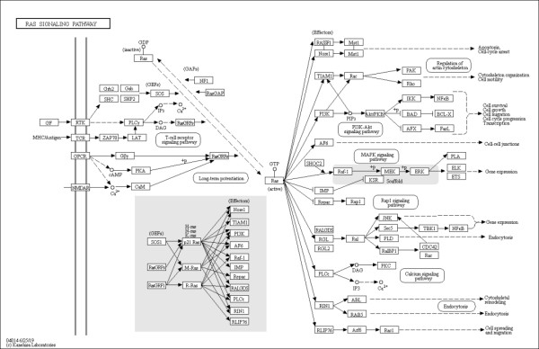 在Ras信号通路里的那个灰色框中,很明确地表示了不同Ras的激活通路以及下游效应分子,你会发现MAPK只是在众多Ras激活通路中的一支: