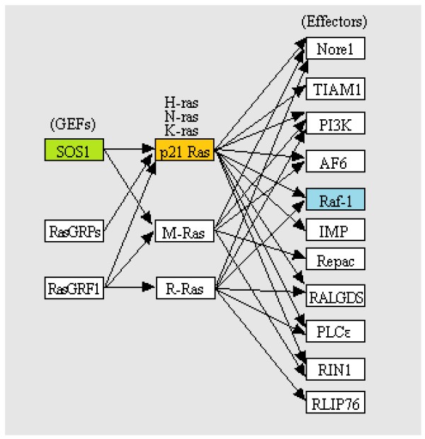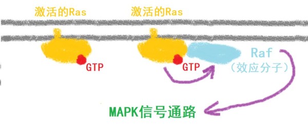 激活后的Ras会激活下游的效应分子,比如Raf,如果Raf被激活,则MAPK信号通路就被激活了: