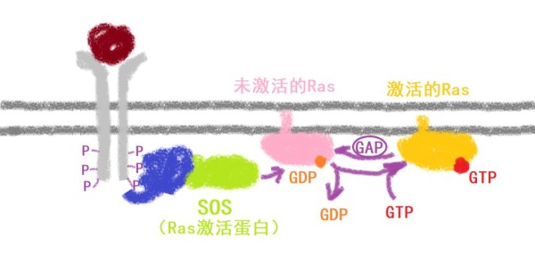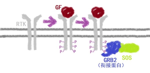 首先,膜表面的RTK等受体(例如EGFR等等)接收到了GF(生长因子),并结合。接着RTK被磷酸化,磷酸化的RTK会结合上GRB2之类的衔接蛋白,衔接蛋白则结合上SOS(Ras激活蛋白):