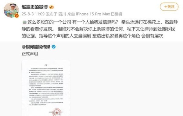 她发微博怒怼经纪公司银河酷娱,直接点名“划走资金”“断绝沟通”,这操作堪称年度最燃职场大戏现场版。