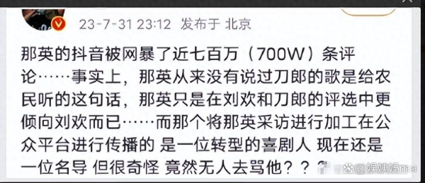 在那个视频的评论现在已经突破了800万,而在20年前的那英和刀郎事件是网络流传的那英点评刀郎的经典最早出自于当时的娱乐主持人大鹏在节目里面的娱乐效果,因此导致两方被网络暴力这么多年。