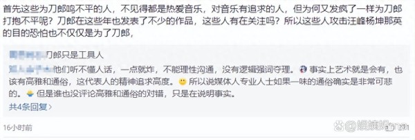 对此网友们开始灵魂的发问:为刀郎所鸣不平的人,真的是热爱音乐的吗?在2014年之后刀郎复出过几次还发表了好多作品,只是这些作品没有荡起水花来,所谓心疼刀郎而做出攻击其他歌手的行为是为了自己的私欲吧。