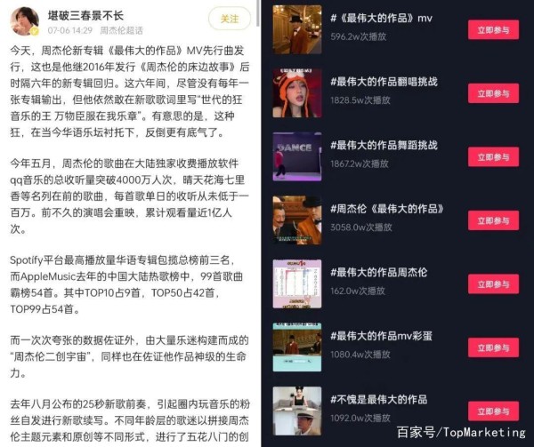 除了以上提及的三个独家平台,微博和抖音作为用户体量较大的平台,也同样承担了扩大热度的功能。在微博平台,除了热搜榜单话题定制,引导用户关注讨论,不少有影响力的自媒体大V也会利用微博的文字传达功能发布中长篇图文,在对周杰伦影响力的回顾和总结中引发大众共鸣,提升用户好感;在抖音平台,《最伟大的作品》相关“翻唱挑战”、“舞蹈挑战”、“变装挑战”层出不穷,抖音天然的bgm承载基因搭配与短视频适应度极高的多种类挑战,助推了歌曲的传播发酵。