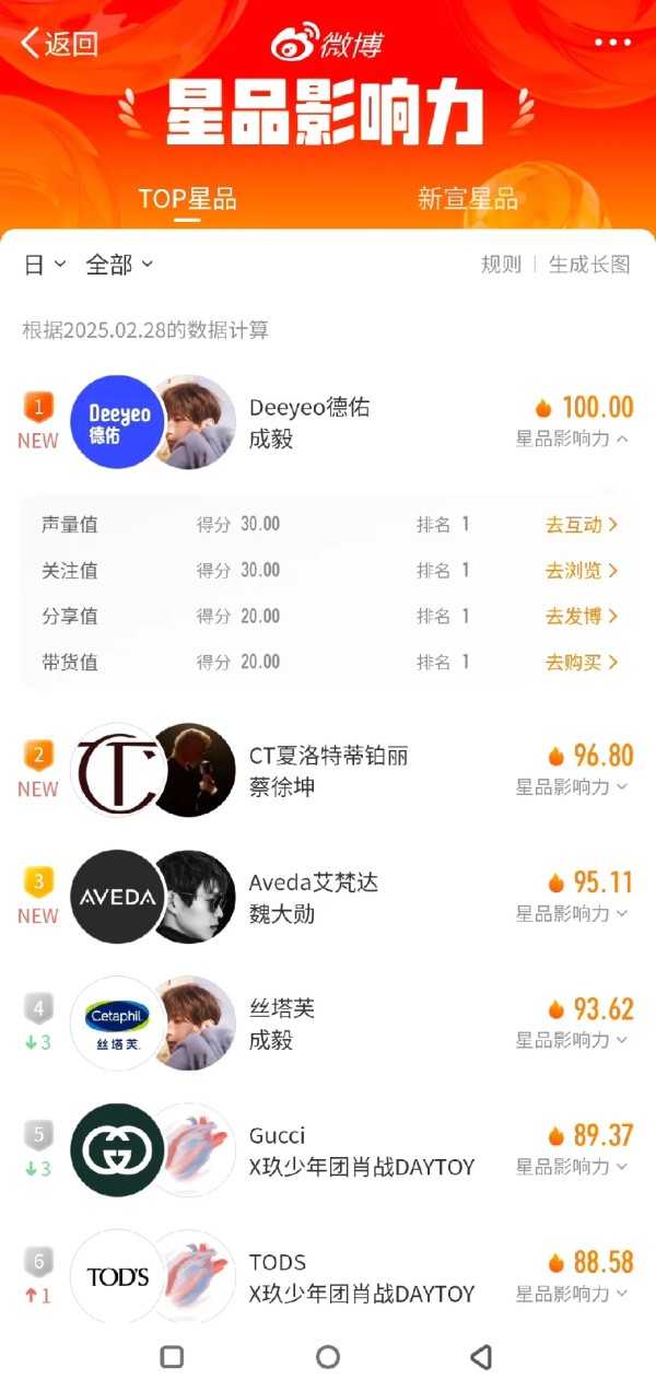 成毅在“星品影响力”榜单中又又是满分100 top1,光2月份官宣三个商务,销量,声量,影响力均第一,成毅拥有庞大的粉丝基础,强大的商务号召力,自身影响健康阳光积极正能量,成为了品牌宠儿