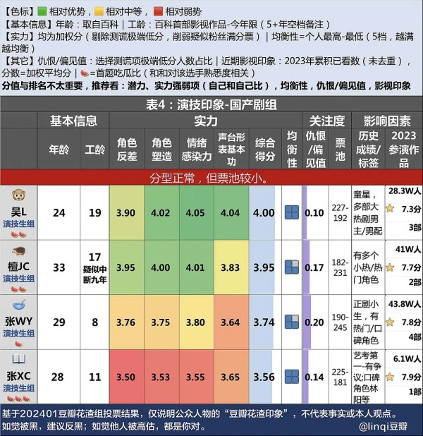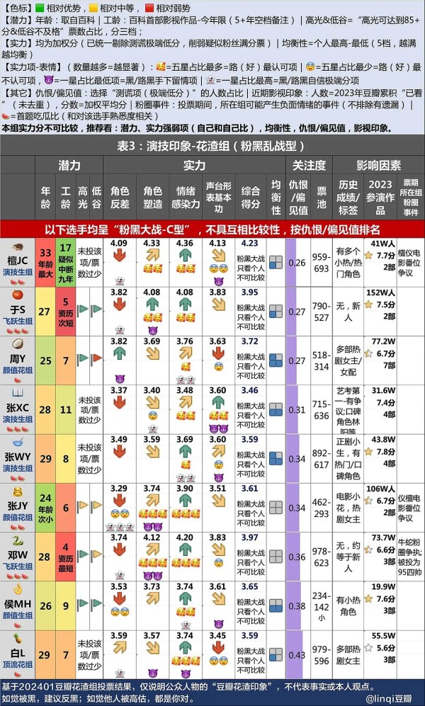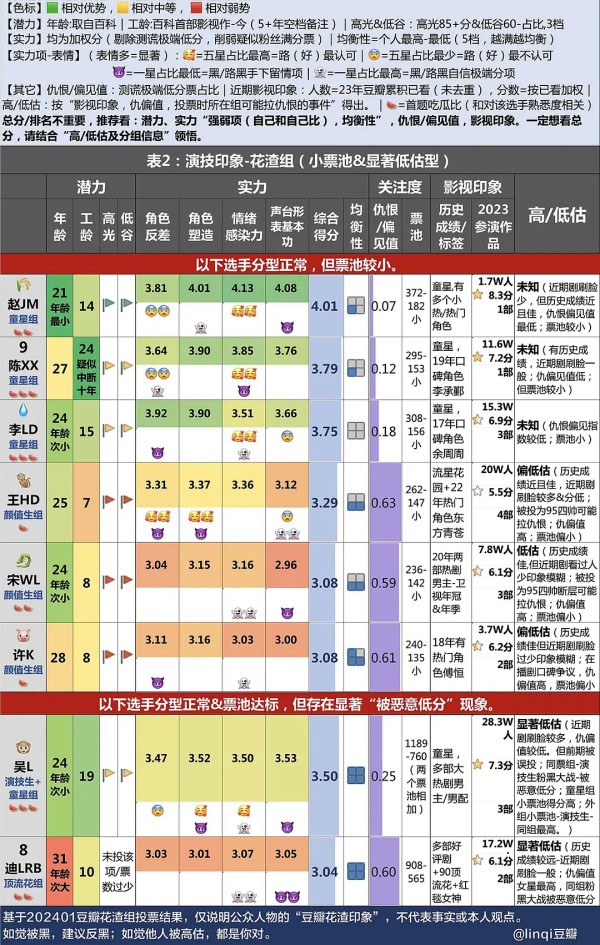 附2-看图方法: 统一色标原则(重要):所有有颜色的地方都一个标准,越绿越好,越红越不好。 表头一共分四部分: 潜力: 1-年龄(取自百科),越小,可能性越大。 2-资历(百科首部影视作品至今年限),一般和稳定度成正比,和发展空间成反比,超出5+年空档期的会标下。 3-高光票&低谷票:分三档,按色标原则标出。 实力: 1-各项得分及总分:加权分。 2-均衡性:个人最高-个人最低后,按选手得分区间分五档,图标蓝色块越被点满=越均衡。 4-表情=五星占比最多的一项(相关理解:无脑粉丝倾向于给所有项打五分,那么最多的一项就是路/路好们更认可的项。) 5-表情=一星占比最少的一项(以“无nao黑子倾向于给所有项打一分”为理解,最少的一项是黑/路黑也觉得不太无nao黑得下去的一项) 6-表情=五星占比最少的一项(路/路好也觉得相对不认可的一项) 7-表情=一星占比最多的一项(黑/路黑觉得打一分无负担的项) ——表情解读是为了方便理解,并不严谨绝对(娱乐解读别gang哈)。