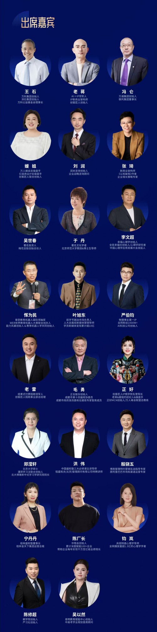 本届峰会嘉宾阵容堪称“天花板级”,涵盖多位知名企业家、AI专家与IP领域领军人物。万通集团创始人冯仑将分享《做久的智慧》,万科集团创始人王石带来《穿越周期的智慧》,两位地产界巨擘同台,为创业者提供长期主义的战略思考。