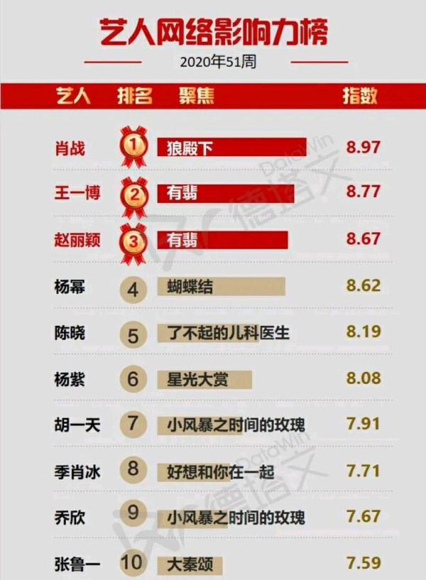 艺人最具影响力排名:杨幂仅第6,肖战跌出前3,榜首才是顶流大咖