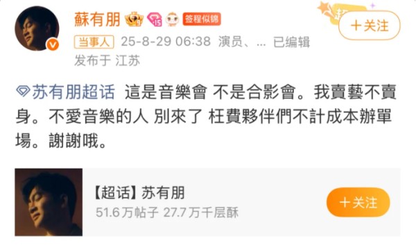 随着争议在各平台发酵,苏有朋本人在微博超话的强硬回应成为引爆点。“卖艺不卖身”的尖锐回应,瞬间点燃了舆论怒火。这种将“商业权益”与“人身隐喻”相挂钩的说法,被大量网友指责为既侮辱粉丝又逻辑双标。