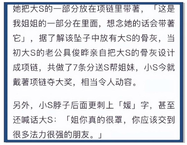 在接受媒体采访时,小S频繁地抚摸着胸前的项链,似乎在向人们展示着什么。当被问及项链的由来时,她深情地分享道:“这是姐姐留给我的一部分,每当我想念她时,都会戴上它。”原来,她佩戴的项链竟然是由大S的骨灰精心制成的。在旁人的提醒下,她似乎意识到自己的情绪已经影响到了周围的人,于是,她深吸了一口气,继续投入到接下来的采访中。