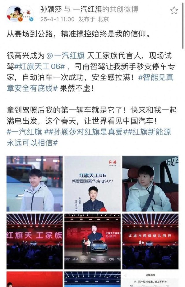 网友爆料孙颖莎与红旗代言一年前就谈好了,只为等孙颖莎拿到驾照