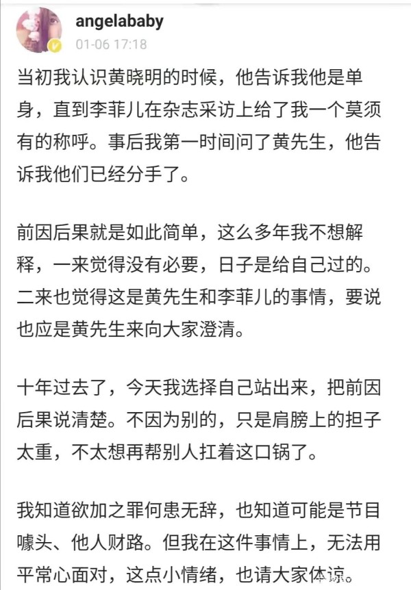 到如今,baby无缘无故地卷入了黄晓明和李菲儿的感情纠纷里面,自己不知道怎么了就成了“小三”?巨大的委屈压得她喘不过气来了。在发文里对黄晓明的称呼就可以看出,两人似乎不再有感情了,只有同事,朋友般的友谊。