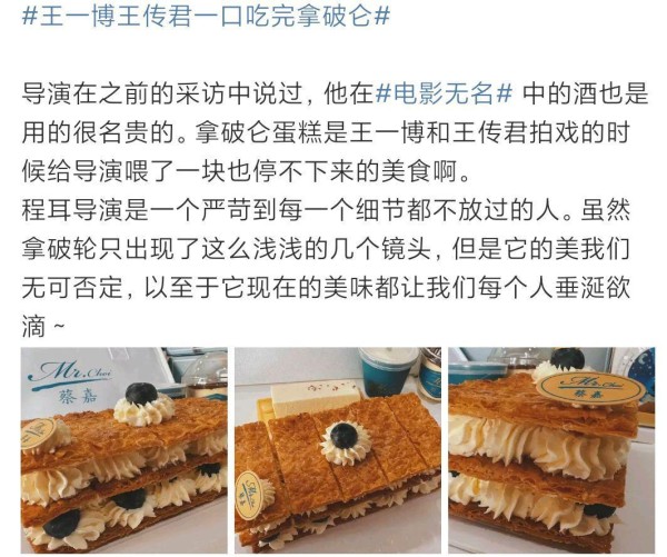 程耳导演还不忘记补充道,说那种拿破仑蛋糕价格还挺贵的,一块要600多,前前后后,光拍这个就花了上万块钱。