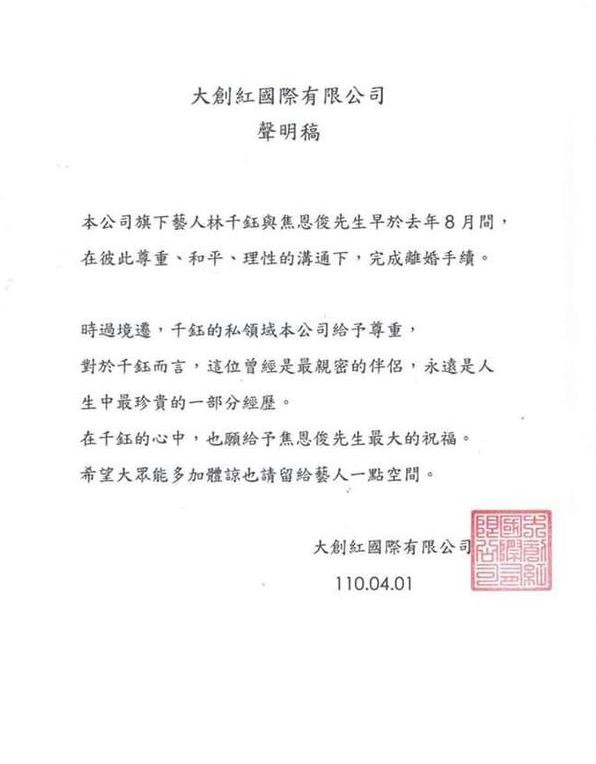 4月1日,据台媒报道,焦恩俊与林千钰两个人结婚六年多但很早就被曝出在冷战,夫妻关系已经名存实亡。1日终于通过经纪公司发布声明,宣布二人已经离婚的事实,声明中写道两个人在去年8月已经完成了离婚手续,林千钰给予焦恩俊最大的祝福。