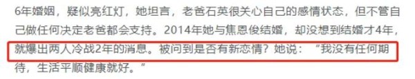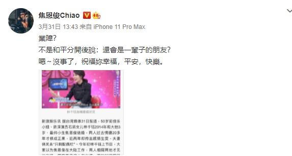 焦恩俊本人看到这份报道的时候,还在微博发声:“业障,不是和平分开后说还会是一辈子的朋友?没事了,祝福你幸福,平安,快乐。”承认了自己已经跟林千钰分开的事实,焦恩俊还表示自己的心态很健康,会将不好的情绪隐藏起来。