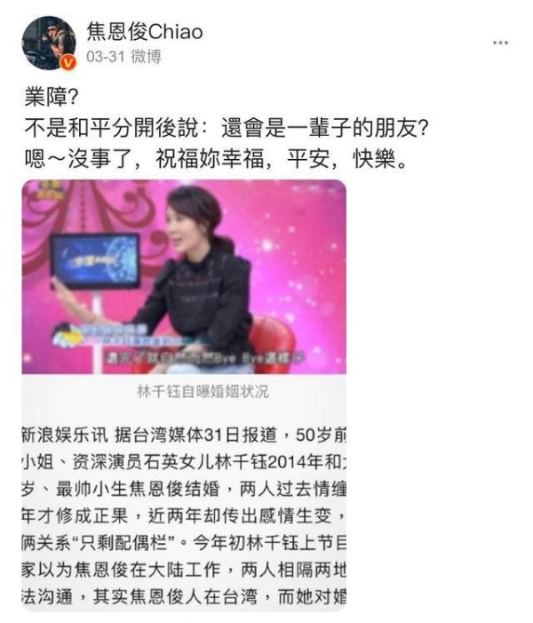 焦恩俊尴尬回应,业障?不是和平分开后说:还会是一辈子的朋友。嗯,没事了,祝你幸福,平安,快乐。