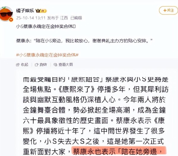 更微妙的是,今年金钟奖主题是“陪伴”。 这完全契合了蔡康永陪小S复出的核心叙事。 台媒甚至爆料,颁奖环节设计了两人的互动彩蛋——可能会重现《康熙》的经典开场舞。