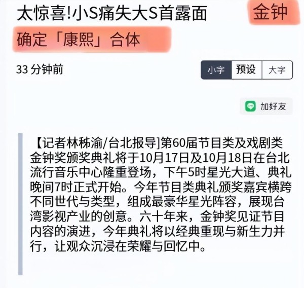 观众期待的从来不只是“回忆杀”。 今年金钟奖海报刚公布,就有网友发现细节:官方特意把蔡康永和小S的站位排在一起,背景色调选了《康熙》经典的酒红色。