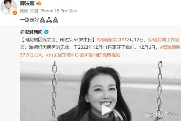 在得知周海媚离世的消息后,她第一时间发文表示哀悼:“一路走好!”这简短而深情的四个字,包含了陈法蓉对周海媚无尽的哀思和怀念。