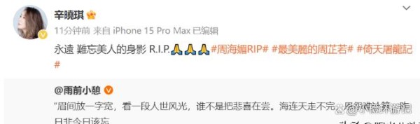 与此同时,辛晓琪也转发了一条网友的微博,并简单地附上了一句:“永远难忘那人的身影 R.I.P.”她的文字简短而深情,表达了对周海媚的深深怀念。她的语气中透露出无尽的哀痛,让人感受到她内心的痛苦和不舍。