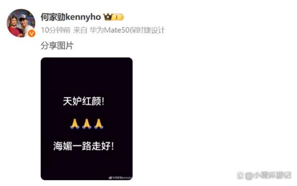 何家劲则晒出了一张黑底白字的图片,上面写着:“天妒红颜!海媚一路走好!”这样的表达方式,既传统又深情,显然他对于周海媚的离世感到十分痛心。