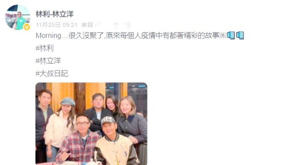 据香港娱乐媒体近日披露,资深男星林立洋在其个人社交平台上分享了一张聚会的合影,并感慨道:久违的聚会,原来这段时间大家都经历了许多精彩的故事。