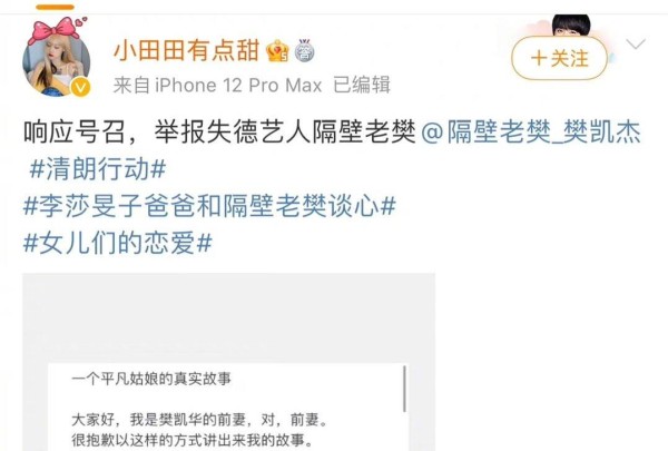 “小田田有点甜”举报隔壁老樊嫖娼,把隔壁老樊在KTV找小姐的视频发给了李莎旻子,李莎旻子却表示“不介意”。非著名娱评人吴清功指出:如果“小田田有点甜”说的是真的,那李莎旻子真够大度的。