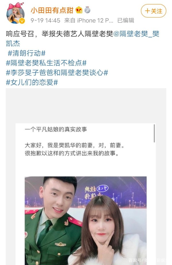 近日,《女儿们的恋爱》中,比较甜蜜的一对隔壁老樊与李莎旻子出事了,隔壁老樊被网名“小田田有点甜”举报了,举报他是“失德艺人”,有图有真相,而举报者自称是隔壁老樊哥哥的前妻。