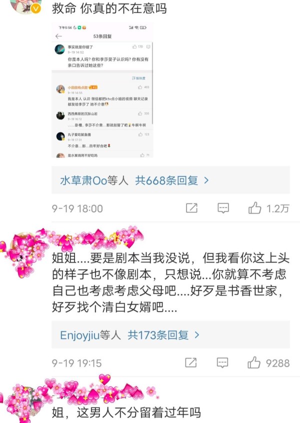 不过,在小田田发文举报后,这对甜蜜情侣都没有回复,热心的网友忍不住提醒李莎旻子“救命,你真的不在意吗?”“姐姐……你就算不考虑自己也考虑考虑父母吧,好歹是书香世家,好歹找个清白女婿吧”“姐,这男人不分留着过年吗?”等等,一时间李莎旻子的评论登上了热搜,而当事人似乎还在“苦苦挣扎”没有回复。