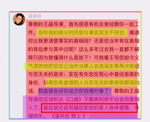 不少网友想起了温兆伦和女明星陈梅馨的爱情故事,两个人分手以后闹上法庭,男方向女方讨要14万,称其欠款,女方称男方向其讨要恋爱期间花费,当时两个人闹得很不愉快,整个娱乐圈人尽皆知!温兆伦看到王晶的视频,直接在评论区留言硬刚王晶,问候了王晶全家,称王晶讲述的事情与事实不符合,怒斥王晶讲述别人的事情为了博眼球,博流量,有损形象!