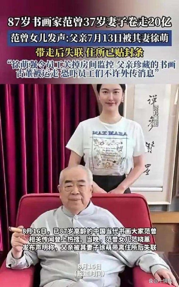 范曾那老先生,86岁了,硬是娶了个小50岁的。他女儿直接傻眼,后妈比自己还小,这叫什么事儿?苦口婆心劝了半天,结果呢?父女关系闹僵了,现在老头子理都不理女儿。小娇妻那边,最近还传出带着他“人间蒸发”的消息。