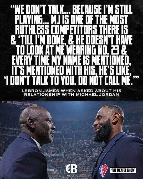 詹姆斯最近谈到自己和乔丹的关系时说,他们现在没联系,因为他还在打球,而乔丹是个特别狠的竞争者。詹姆斯说,自己选23号球衣确实是受乔丹影响,但这和耐克没啥关系。