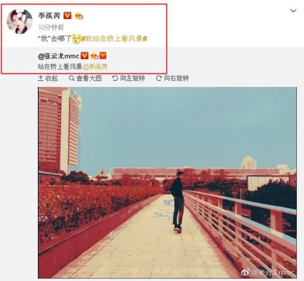 首先是张云龙突然喊话李溪芮说:“站在桥上看风景”,照片中也是很应文字的桥上风景照,而这个照片的角度也颇有些女友视角。不一会儿,李溪芮就回复了,说到:“我去哪了?”这波互动真是超级暧昧,难道是在暗示自己就是那个拍照的人儿吗?