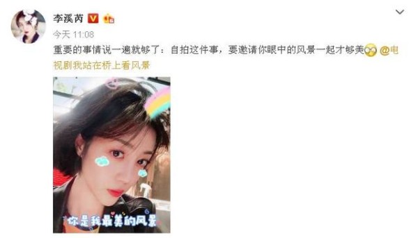 虽然这波互动从表面上看过去像是张云龙在为李溪芮的新剧做宣传,但是要知道这个新剧的男主角是可是姜潮,而李溪芮宣传此剧的时候都没有@姜潮,中午发的自拍照也很暧昧,配文是:“自拍这件事,要邀请你眼中的风景一起才够美”,这样的话语再联想到张云龙晚上的桥上风景照,还真是巧合无数。难道这一对CP是在偷偷发糖吗?