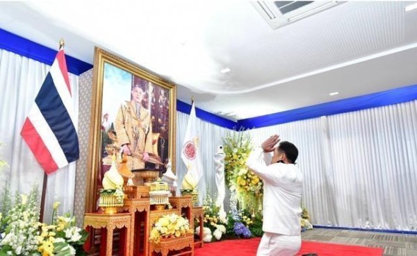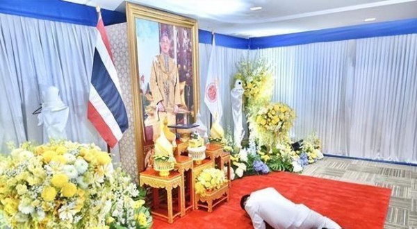 阿努廷就很虔诚地跪拜了泰王拉玛十世的照片,那姿势,像在祭拜神一样
