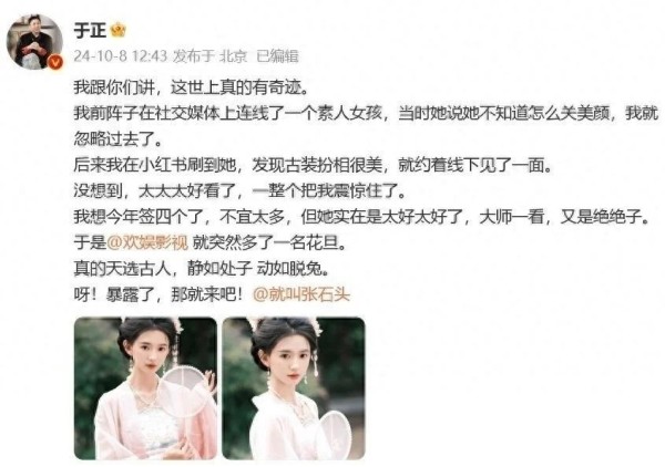 10月8日中午,于正宣布新签约素人美女张石头(张婉莹),大赞对方外貌“真的天选古人,静如处子动如脱兔”。