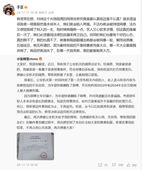 11月13日,张婉莹晒出北京市公安局朝阳分局终止案件调查决定书,称报案后,公安机关第一时间找到了第一次发布相关内容的人,此人表示所发内容为故意捏造的不实信息,当年很快就删除了原博,并没有料到2022年和2024年会在互联网上被大规模传播。