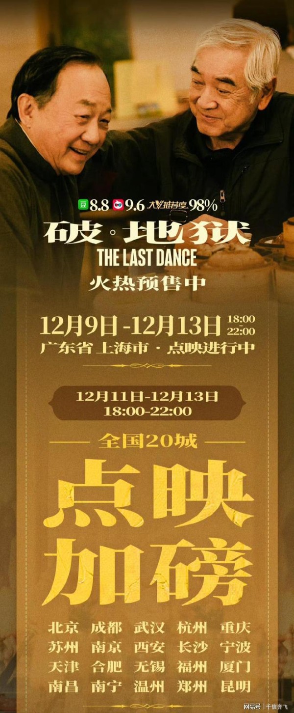 【影讯】英皇点电影制作&出品,杨受成担任出品人,陈茂贤监制、编剧和导演,黄子华、许冠文、卫诗雅、朱康柏和周家怡领衔主演,秦沛、金燕玲、韦罗莎和梁雍婷主演《破·地狱》香港市场上映一个月票房超过1.26亿港币,中国内地市场在广东省和上海市点映三天连续三天上座率和场均人次位列榜首,接下来从12月11日(明天)起将在北京、成都、武汉、杭州、重庆、苏州、南京、合肥和西安等20个城市开启点映活动,影片自从在香港上映以来口碑炸裂,得到诸多业内人士一致好评,周润发、梁朝伟、陈奕迅和张学友等纷纷力挺;
