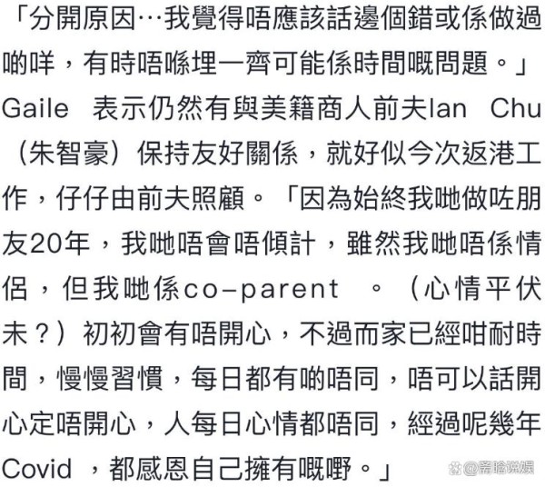 2023年2月,乐基儿的社交平台上出现了一条令人疑惑的消息,她自称为“Co-Parent”,这一词汇让人猜测她是否已经与现任丈夫离婚。然而,在同年4月,她却被曝光与丈夫一同带着儿子到主题乐园游玩,引发了更多关于她婚姻状态的猜测。直到半年后,乐基儿才在香港时装活动上正式承认已经离婚,她坦言与第二任丈夫结束了婚姻,而他们的孩子将由对方照顾,留在美国生活。