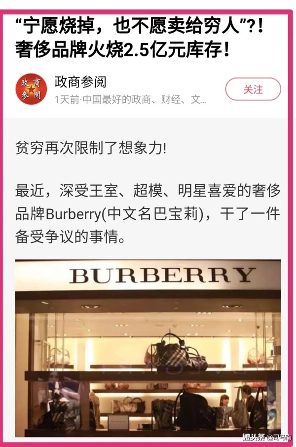 最近国外媒体纷纷报道,深受王室、超模、明星喜爱的奢侈品牌Burberry(中文名巴宝莉) 2017年总共烧毁了价值 2,860 万英镑的商品,约合人民币 2.5 亿元。