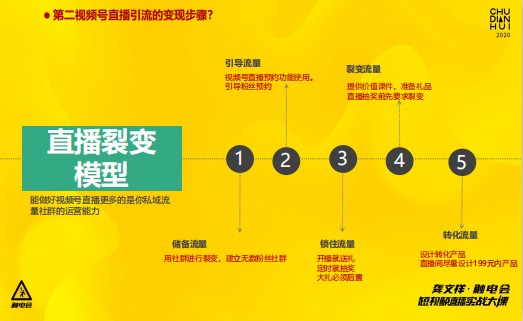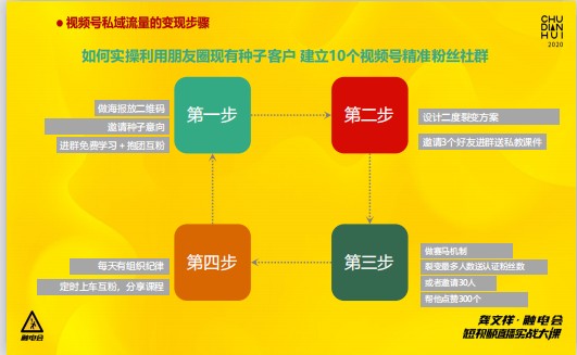 第4个就是裂变流量,我们现在做的事情就是准备有价值的课件,每一场直播,然后都准备不同的课件,让所有的人帮助我们直播前期裂变。